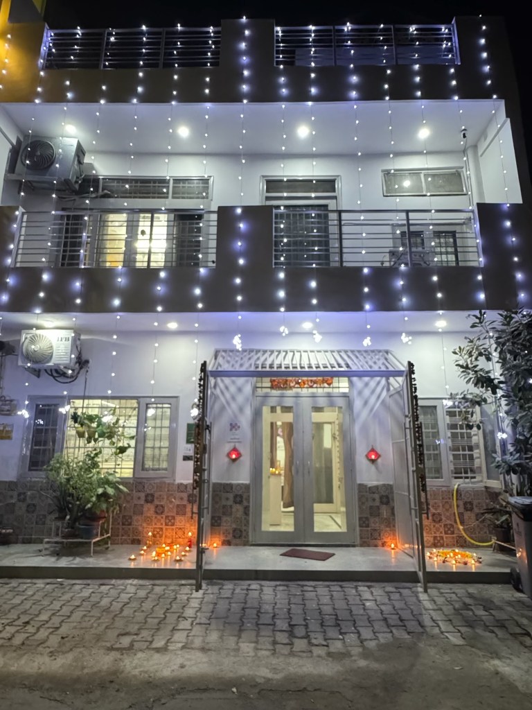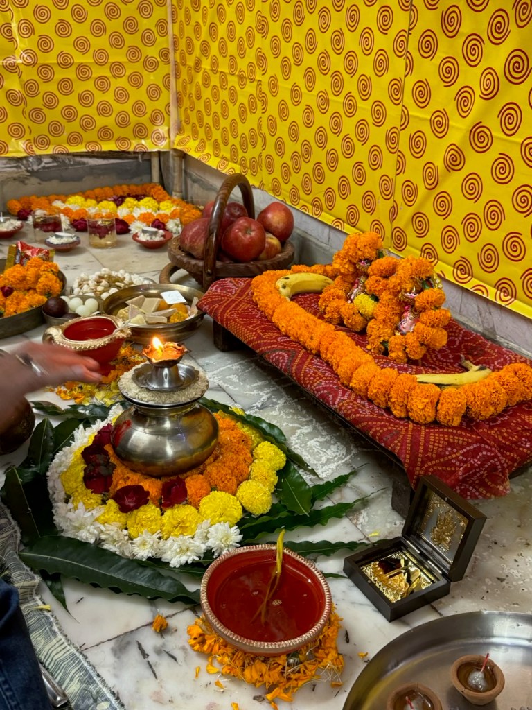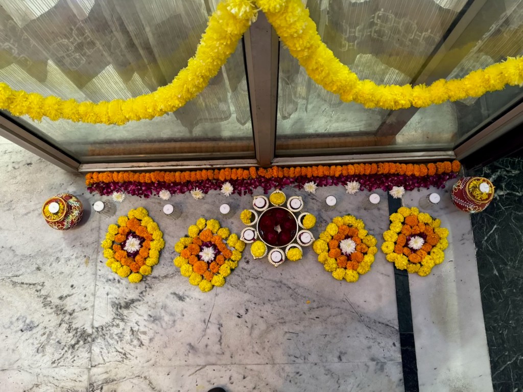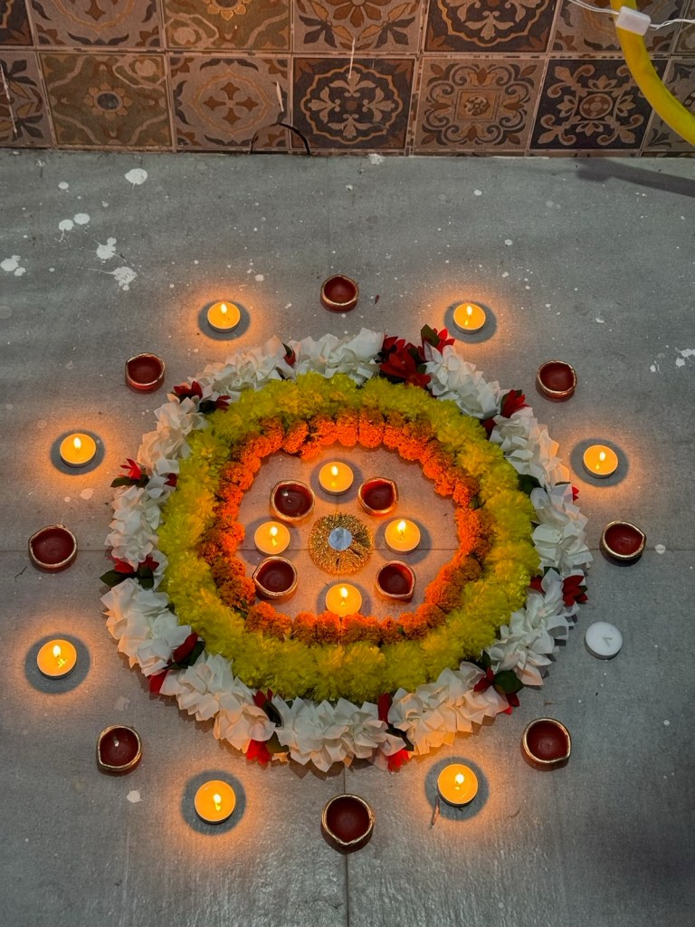 We decorated our house with lights. My mom called an electrician to arrange the light strips in front of the house and it was looking very beautiful. Just outside the main gate me and my mom made rangoli with flowers and tea light candles. We made it along the pattern and our house was looking unique.