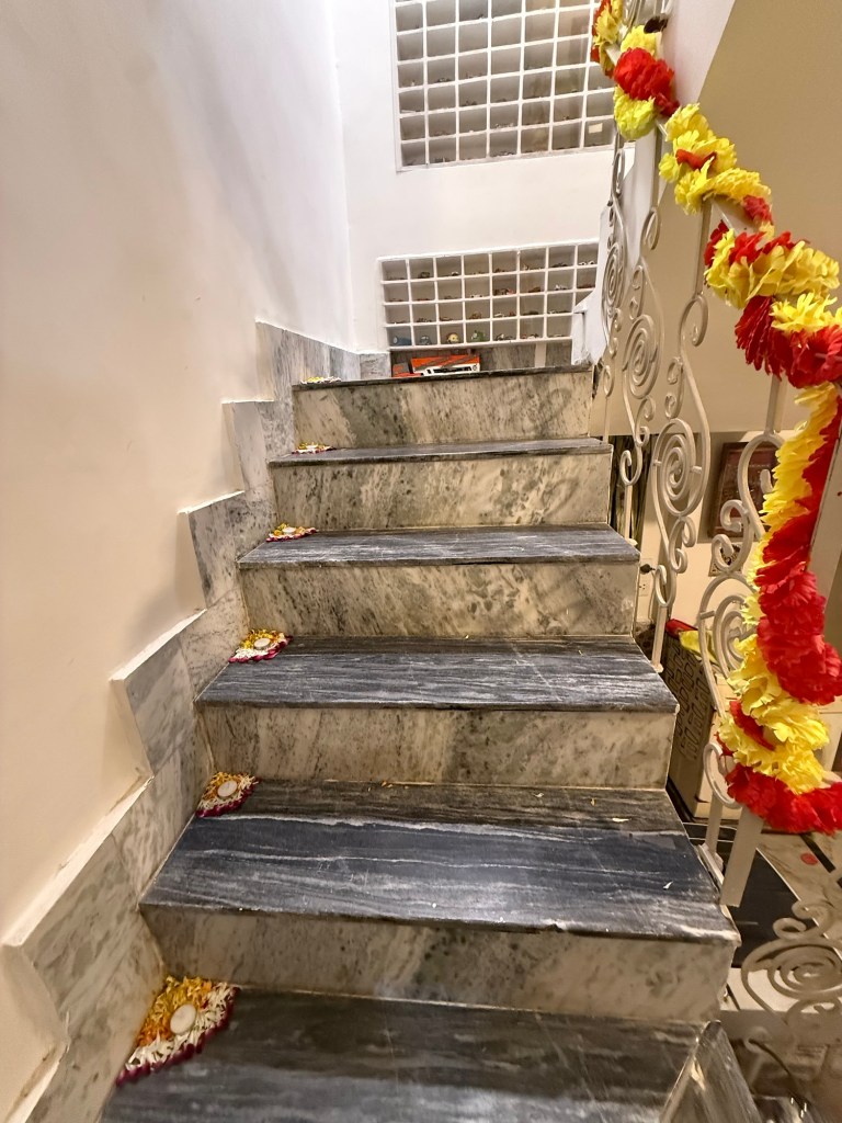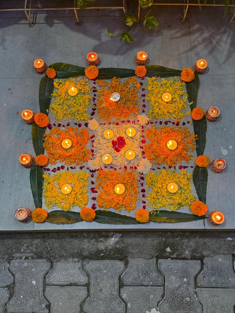 In the context of preparations we made a lot of Rangolis but not by color but with flowers and it looked beautiful. We also put Diyas on the rangolis which enlighten the whole house from inside as well as outside.